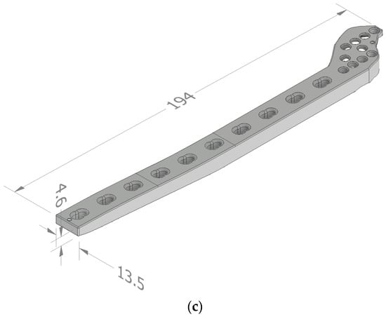 The initial custom-fit fixation plate design ‘INT-BP’ was created in Autodesk Inventor 2019 (Autodesk, San Francisco, CA, USA) based on the 3D digital tibia bone anatomical data and considered a distal tibia locking compression fixation system to treat a spiral distal tibia fracture with a length of 194 mm, of width 13.5 mm and thickness of 4.6 mm, as shown in Figure 1. Synthes distal tibia locking compression plate (X39.912) was used as a design reference [34].