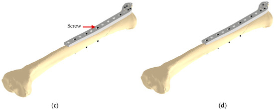 In order to achieve custom-fit optimized plate, the finite element analysis in the optimization procedure considered a bone-screw-plate model (i.e., an assembled bone-plate construct) as shown in Figure 2. Although the SIMP approach is not affected by the magnitude of the load, the loading conditions are considered to simulate a 10% bodyweight of the patient’s weight (i.e., ~70 N) during swing phase and subjected to the proximal tibia region (Figure 2a) [37,38,39]. The distal tibia region was fully constrained in order to prevent the model floating. Following the standard practice of fracture fixation, two different screw configurations (i.e., location and number of screws) was considered (Figure 2c,d) [40]. The screw configuration is expected to influence fracture stability and topology optimization procedure [40]. The locking head screws were modelled in Autodesk Inventor 2019 (Autodesk, San Francisco, CA, USA), each screw has a 3.5 mm diameter head and a main body of 2.5 mm in diameter and 35 mm in total length. For simplicity, screw threads were neglected. Fixation plate and screws were applied with an elastic modulus of 120 GPa, and a Poisson’s ratio of 0.3, assuming Ti-6Al-4V as the material. In terms of the bone, only the cortical region was considered in this simulation with a Young’s modulus of 18 GPa and a Poisson’s ratio of 0.3 [41]. The implant holes, screws and bone models were considered as non-design regions. Based on a previous mesh convergence study [24], all models in the finite element analysis considered quadratic tetrahedron elements C3D10, and the considered number of elements is shown in Table 1. In order to simulate the no friction or contact of the Locking Compression Plate technique, a gap of 0.5 mm was imposed between the bone and plate. The screw head were securely locked (i.e., tie-contact) to the plate, and the bone was secured to the screws [41].