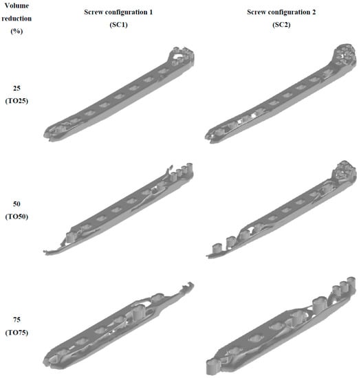 Topology optimization model was considered to tailor the strength-to-weight ratio by maximizing the stiffness while reducing 25, 50, and 75% of the initial volume of a custom-fit distal tibia bone plate ‘INT-BP’. The aim is to reduce as much volume as possible without risking plate instability to minimize the overall equivalent stiffness. Topology optimization for each screw configuration resulted in three different optimal designs, as shown in Figure 4. Consistent with other findings, the resulting designs align with the stresses distributed from the considered loading and boundary conditions, hence presenting non-uniform designs [20,37]. The results reported an acceptable volume from all obtained designs within less than 5% of the user-defined volumes. Designs considering higher volume reductions have been shown to remove the entire connection between some of the screw holes (e.g., TO75-BP), thus decreasing the number of screws in the plate.