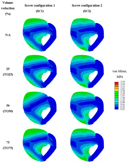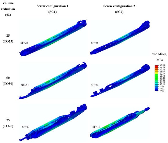 The mechanical stability and stress distribution in Figure 6 shows a clear increasing trend with an increase in the volume reduction of bone plates. The stresses value increased up to 13% with a volume reduction of 75%, considering both screw configurations. This validates the topology optimization (SIMP) algorithm; by maximizing the design’s stiffness and controlling its volume reduction, the bone plates are now capable of distributing increased stresses at the fracture region. This is a clear indicator that the stress shielding phenomenon is reducing by optimizing the plates. All plates resulted in less stresses than the tensile strength of the Ti-4Al-6V and presented an acceptable safety factor (SF), which is always intended to be higher than >1 for any design to be accepted [49]. However, further biomechanical parameters such as screw threads must be considered in the finite element model to represent their role on implant-screw load transfer.