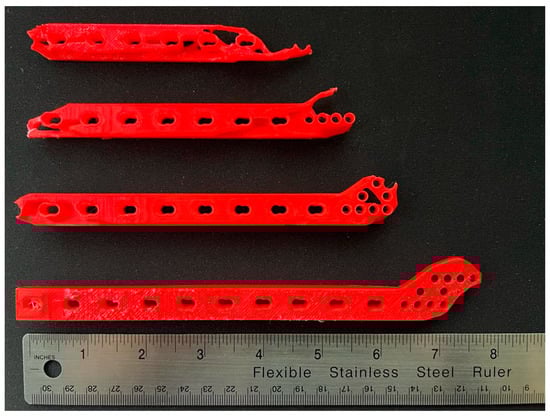 Additive manufacturing has become widely popular due to its ability to manufacture complex geometries with topology optimization becoming an important tool in the manufacturing of advanced parts [50]. In a previous study [51], the author presented work verifying and validating the considered finite element analysis by additive manufacturing Ti-4Al-4V topology-optimized generic bone plates in an experimental comparison. This paper used an FFF AM to examine the ability of additive manufacturing to prototype and a produce physical model of an optimized implants. The manufactured implants demonstrate that additive manufacturing is capable of fabricating the obtained optimal designs of a distal tibia custom-fit plate, as shown in Figure 7. Common FFFs are quite accurate with an XYZ step size of 0.078–0.78 μm, resulting in acceptable geometrical differences between the digital and physical model. FFF is commonly used to produce implants as a plastic prototype to allow the surgeon to visualize the custom-fit implant pre-operation and prepare a surgical plan [52]. However, metal-based additive manufacturing must be explored in future work to validate the designs presented in the study. For example, Iqbal et al. [22] have presented a useful roadmap to optimize and manufacture a pelvic prosthesis using metal additive manufacturing. However, topology optimization technique does not address nor consider additive manufacturing constraints and challenges such as overhanging structures, thermal warping and material anisotropy. Further development on the topology optimization of these implants must consider these constraints prior to fabricating in a metal-based additive manufacturing process.
