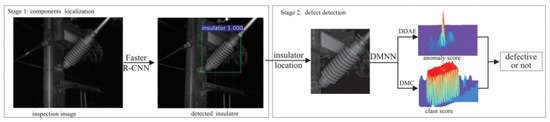 Kang et al. [37] focused on detecting defects in the insulator, which is a catenary component. Figure 1 shows the proposed workflow of catenary defect detection. Their proposed framework captured images of areas where insulators are usually located using fixed-viewed cameras. Next, a Faster R-CNN model localized the specific location of the insulator in the input image (i.e., object detection). Finally, two other deep learning models were implemented to examine the extracted images of the insulator. One model was a deep learning classifier that had a CNN-DNN structure to output the classification score of the input image. The other model was an auto-encoder model that outputs the abnormal score of the insulator. The abnormal score determines whether and how the insulator is damaged. Actual data from Hefei–Fuzzhou high-speed railway line was used for evaluation. The results showed that the proposed framework effectively mitigates the small data problem and the complexity of processing catenary images, which can cause a decrease in diagnosis performance.