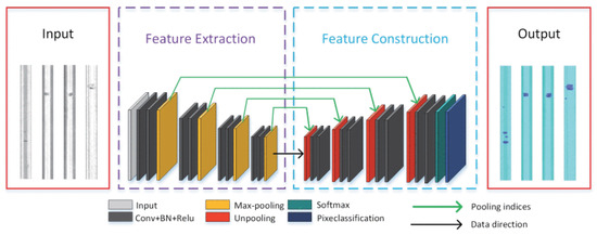 Some studies proposed deep learning methods to extract defects more detailedly using image segmentation. Kim et al. [5] adopted image segmentation to distinguish specific areas of defects on rail surfaces. The defective part was labeled in units of image pixels to train the segmentation model. The proposed model was implemented based on the VGG-19 structure and showed IoU and F1 scores exceeding 90%. Liang [50] proposed SegNet, a deep convolution neural network, to detect defects on rail surfaces. As shown in Figure 4, SegNet comprises feature extraction (FE) and feature construction (FC). This structure can learn rail surface types and their distributions from a given training dataset.