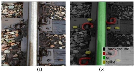 Defect inspection of rail components (e.g., spikes that secure rails to ties and clips that press down on the bottom of the rail to concrete ties) commonly depends on the judgement of individual human inspectors. Many studies have used deep learning models to improve manual rail component inspection. Guo et al. [58] proposed a framework that can detect pixel-wise rail accessories in real time using CNN-based models that receive high-resolution rail images, shown in Figure 5. Their proposed framework shows a speed of over 30 FPS in high-resolution processing video in real-time. These results show that inspection video can be quickly converted into helpful information to aid rail maintenance. Similarly, Gibert et al. [59] proposed CNN models to perform defect detection in rail ties and fixtures.