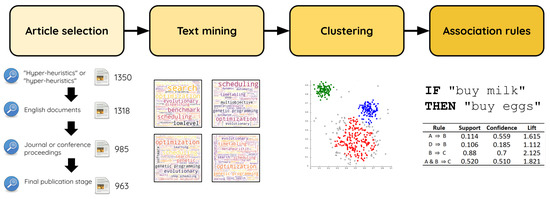 For this study, we used Scopus to collect information about the current literature related to hyper-heuristics. We chose Scopus because it is a citation database recognized worldwide for many peer-reviewed journals in different domains [35,36]. Other works have also considered advanced search and text mining techniques to review the literature indexed in Scopus [7,37,38], albeit in other fields. We extracted the information from the articles considered in this work from Scopus on 5 April 2022. To conduct such a review, we followed four steps: