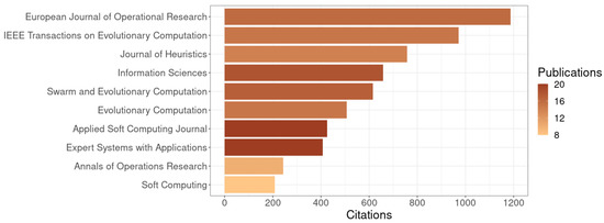 Distribution of citations and number of documents of the top ten journals with the most citations for documents on hyper-heuristics (obtained on 5 April 2022).