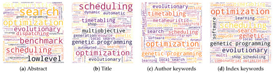 Figure 4 demonstrates the word clouds at the 90th percentile of the most-cited research papers related to hyper-heuristics. We exclude the words heuristic and hyperheuristic, as they are part of the query used to search for the articles. Figure 4a shows the highest-frequency words in the abstract. The most used abstract words are “optimization", “scheduling”, “metaheuristic”, “search", “evolutionary”, and “benchmark”. Figure 4b depicts the most popular words in the title, which include “scheduling”, “optimization”, “timetabling”, “evolutionary”, “genetic programming”, and “multiobjective”. Figure 4c shows that the most frequent author keywords are “optimization", “genetic programming”, “timetabling", “evolutionary”, “scheduling”, and “metaheuristic”. Finally, in Figure 4d, we can observe that the most popular index keywords are “scheduling”, “optimization”, “evolutionary", “genetic programming”, “timetabling", and “software”. Hence, the most frequently mentioned terms in the hyper-heuristic literature involve evolutionary algorithms, optimization problems, and scheduling.