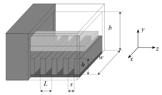 A THz BWO mainly consists of a cathode, an anode, an SWS, an output structure and a collector, as shown in Figure 1 [17]. The electromagnetic wave on the SWS has a phase velocity that is slowed down to be approximately equal to the drifting velocity of the electrons so that the beam–wave interaction can occur under the Cerenkov radiation scheme. A corrugated rectangular waveguide SWS (CRWSWS) is under observation and shown in Figure 2.