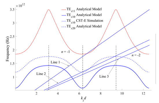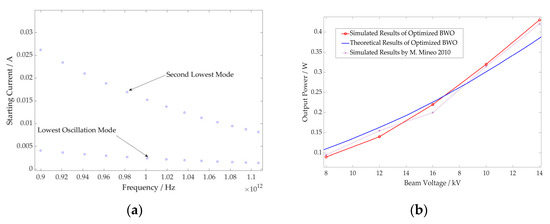 where U1 is the beam voltage corresponding to the beam line (Line 2 in Figure 3) that intersects with the low-frequency cut-off point of the −1 harmonic of the TEx10 dispersion curve and U is the beam voltage. The beam current should be smaller than the minimum starting current of the second lowest oscillation mode in the operating frequency range to avoid mode competition between oscillation modes [7].
