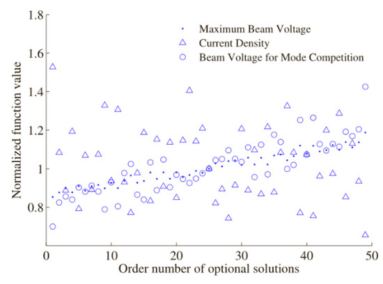 In previous studies on the optimization design of vacuum electronic devices, randomized optimization methods (the first type) such as genetic algorithms (GAs) were used in the optimization design of relativistic backward wave oscillators (RBWOs) [13,14,15]. Unlike non-randomized iteration optimization methods, randomized optimization methods choose a next move not only from the local solutions but also from randomly generated solutions. These ‘strange candidates’ are the key factor for successful optimization of RBWOs because, in these high-power Cerenkov devices, the energy conversion takes place in non-linear regions and small changes of geometrical and working parameters can result in significantly different output performances. Non-randomized optimization methods have low efficiency in the optimization of such devices operating in nonlinear regimes.
