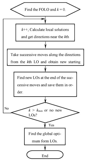 Figure 7 shows the flow chart of the global search algorithm. To avoid an endless loop, the maximum number of LOs is limited by kmax = 1000. However, the search for the global optimum will commonly end due to the failure to find new LOs.