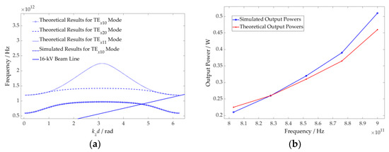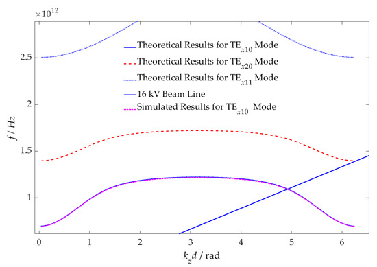When the position of the electron beam and the geometrical parameters of the SWS are given, the working parameters such as the beam current and the beam voltage of the device can be determined with theoretical models [7]. As shown in a previous study, the beam voltage and beam current are constrained due to mode competition [7]. When the device operates at the maximum beam voltage, the corresponding beam line should intersect only with the first backward space harmonic (n = −1) of the TEx10 dispersion curve to avoid the mode competition between electromagnetic modes. This constraint on the beam voltage can be quantitatively described as [7]