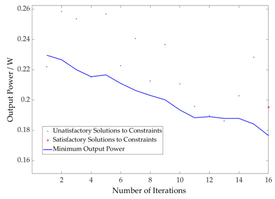 The minimum output power curve in Figure 13 is only auxiliary, which shows the lowest output power from all local solutions for each iteration step. Note that these calculations for local solutions are not necessary for the optimization. The curve is drawn here to show the tendency of the variation of the output power. The curve goes down because the beam current and the beam voltage have to be smaller to satisfy the constraints.