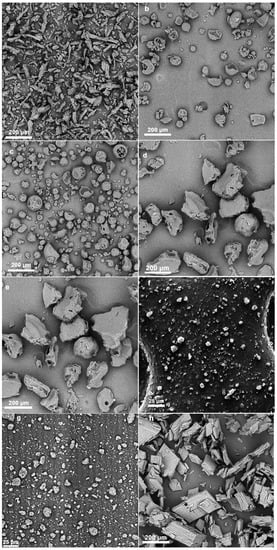 SEM images of particles (a) MCC; (b) PVP K17; (c) PVP K25; (d) PVP K90; (e) PVA Mw30; (f) Esomeprazole Mg (2H2O); (g) Esomeprazole Mg (3H2O); (h) Ondansetron.