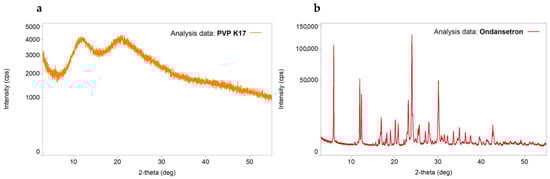The analysis of the crystalline structures of the various raw materials was evaluated by XRD. According to the peak’s characteristics obtained in the diffractograms, it was possible to verify whether each material presented a predominant crystalline or amorphous physical structure. Figure 2 illustrates two diffractograms of different solid structures—crystalline (ondansetron) and amorphous (PVP K17). The XRD diffractograms of the other raw materials are presented in the Supplementary Materials (Supplementary Figures S1, S3, S5 and S7).