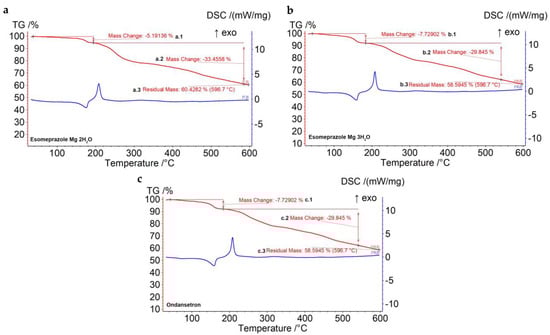 STA thermograms of active pharmaceutical ingredients (APIs): (a) Esomeprazole Mg 2H2O (a.1—Mass Change: −5.19%; a.2—Mass change: −33.46%; a.3—Residual Mass: 60.43%), (b) Esomeprazole Mg 3H2O (b.1—Mass Change: −7.73%; b.2—Mass change −29.83%; b.3—Residual Mass: 58.59%) and (c) Ondansetron (c.1—Mass Change: −9.59%; c.2—Mass change: −72.02%; c.3—Residual Mass: 17.94%).