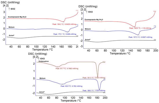 In the case of MCC analysis with each API, the obtained thermogram represents mainly the addition of the ones obtained for each individual ingredient. This means that there is no relevant chemical or physical interaction between these ingredients up to the studied temperature (i.e., 200 °C) (Figure 4). Considering the mixtures obtained with PVPs (K17, K25 and K90) and both esomeprazole Mg 2H2O, 3H2O, there were no notable changes in the thermograms, indicating no significant physical and/or chemical interactions in the mixtures up to the studied temperature (200 °C) (Supplementary Materials—Figures S9–S11). However, in the case of ondansetron, the mixture thermograms were clearly not additive in relation to the ones obtained for each individual ingredient (Figure 5).