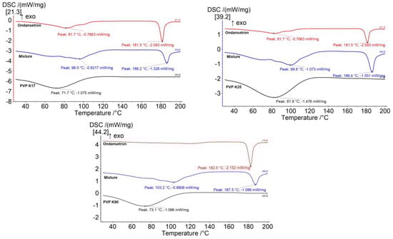 In the case of some binary mixtures, changes in the profile of thermograms (STA and DSC) indicate the production of some interactions as a function of heating. That was the case of mixtures of PVPs with ondansetron. For the other mixtures studied, no interactions were observed up to 200 °C.