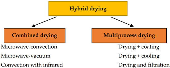 Researchers have started to investigate the potential of combining more than one drying technique. This has led to the development of hybrid drying technologies [20]. Combined (hybrid) drying is a method of combining simple drying techniques into one complex process, e.g., convection, microwave, freeze-drying, and ultrasound. The number of drying methods used in combination is not specified [21,22]. The technology of combining several drying methods is relatively new, constantly improving and developing. The techniques used during combined drying concern: the method of heat transfer, multi-stage, and multi-process drying, and using other treatments in addition to drying, e.g., filtration, and agglomeration. The following is a breakdown of combined drying methods (Figure 1) [23].