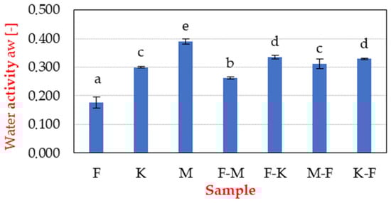The relationship between the drying method and the water activity (aw) parameter was assessed. As a result of the research, the average content of water activity of dried carrots was shown in Figure 2. The lowest value of the examined parameter was characteristic of freeze-dried carrot (F), the water activity of which was 0.176. In turn, the dried material obtained as a result of microwave (M) and convection (K) drying was characterized by the highest water activity, respectively, aw = 0.390 and aw = 0.300, and the differences are statistically significant (Table 2). The combination of freeze-drying with convection-drying (F-K (freeze-drying–convection), K-F (convection–freeze-drying)) and microwave-drying (F-M (freeze-drying–microwave), M-F (microwave–freeze-drying)) results in obtaining water activity with a much higher value and statistically significant difference than in the case of freeze-drying (F). An intermediate aw value was obtained for samples from drying, where the first freeze-drying method (F-K, F-M) was used, the duration of which was much shorter than that of the freeze-drying process.