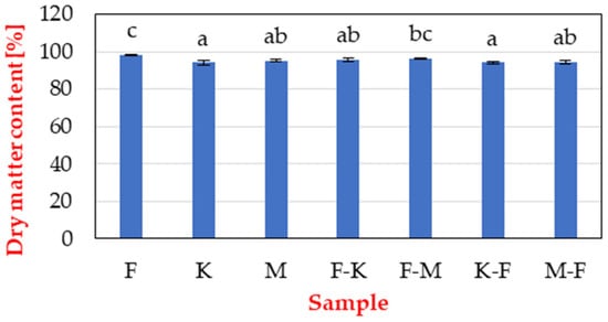 The influence of the drying method on the dry matter content of dried carrots was also investigated (Figure 3) (Table 3). It was shown that all drying methods allowed us to obtain dried material with a dry substance content exceeding 94%. The highest value was observed for freeze-dried carrots (F)-98.36%. The dried material obtained by convection-drying (K) was characterized by a dry matter content of 94.95%. The combination of freeze-drying with convection-drying allowed us to obtain dried samples with the following dry substance content: 95.68% (F-K), 94.11% (K-F), while in microwave-drying 96.47% (F-M), 94.47% (M-F), respectively. All these values of the dry matter content are lower than in the case of freeze-drying at 98.36% (F). On the other hand, combined drying methods using freeze-drying as the first technique (F-K; F-M) did not differ significantly in terms of dry matter content. The freeze-dried sample with microwave-drying (F-M) was characterized by a similar level of dry matter content to the control sample, which was freeze-dried (F). Carrot samples in which freeze-drying was used as a drying step (M-F, K-F) did not differ in the dry matter content.