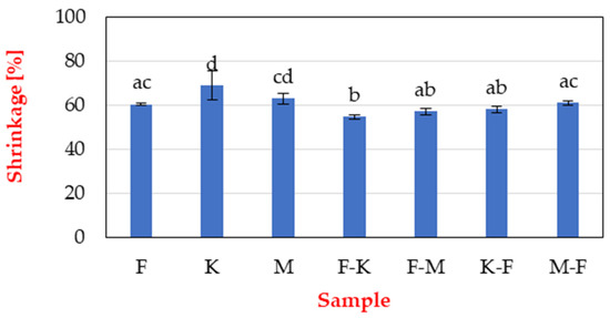 The average values of shrinkage are presented in Figure 5. It was shown that the applied drying methods affected the material shrinkage. The highest value of shrinkage is characteristic of convection-dried carrots (K), for which this parameter is 68.95%. The dried material obtained by the methods of combined drying with the use of freeze-drying (F-K, F-M, K-F) was characterized by shrinkage with lower values not significantly different from each other (Table 5). The results ranged from 54.75–58.16%. The lowest shrinkage is characteristic for carrots subjected to combined drying (F-K) 54.75%. Between the results of shrinkage for dried samples (F-M) 57.29% and (K-F) 58.16%, there was no statistically significant difference. Similar relationships were obtained between samples freeze-dried (F) 60.35% and microwave–freeze-dried (M-F) 61.06%, for which the obtained results do not differ statistically significantly.