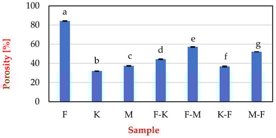 The effect of the drying method on the porosity of dried carrots was shown in Figure 6. The highest porosity value of 84.14% was obtained in freeze-dried carrots (F). The convective dried sample (K) was characterized by the lowest porosity among all drying methods. The combination of freeze-drying and convection-drying (F-K, K-F) allowed us to obtain statistically significant lower porosity of 44.28%, 36.7%, compared to freeze-dried (F) samples but higher than convective dried (K) (Table 6). Differences were statistically significant. The dried material obtained by hybrid (combined) methods with the use of microwaves and freeze-drying (M-F, F-M) had a porosity of 57.16 and 52.06%, respectively, and results were significantly higher than for the microwave-dried (M) 37.38%.