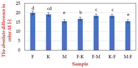 To obtain a complete picture of the color changes that occurred as a result of drying with various methods compared to the color of raw carrot, the absolute difference in color coefficient was calculated (Figure 8) (Table 7). The lowest value of ΔE characterizes the microwave-dried carrot sample (M) 15.52. Carrots subjected to microwave-drying (M) and combined drying using microwaves and freeze-drying (M-F) were the least changed in terms of color, the differences are not statistically significant, and the freeze-dried carrot (F) was the most changed. All the dried samples obtained with the combined methods (K-F), (F-K), (M-F), and (F-M) showed lower values of the tested index than freeze-dried (F), and the differences were statistically significant.