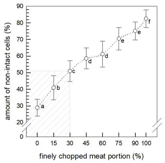 Amount of non-intact cells (n = 16) (mean ± standard deviation) of raw minced meat with finely chopped meat (FCM) added. The shaded area shows the realistic range of the FCM addition. Different letters indicate significant differences (p < 0.05).