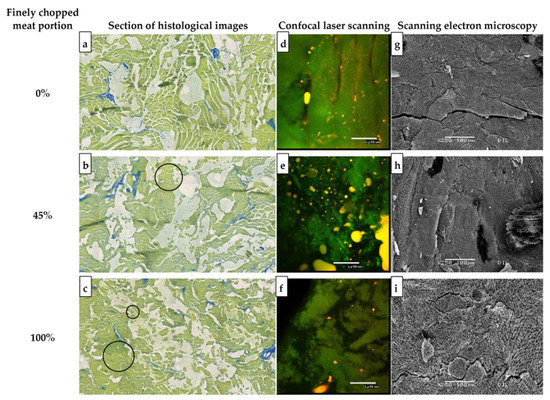 (a–c) Typical section of histological images (magnification 100×; green: muscle, blue: fat, white: not colored; encircled: destroyed cells), (d–f) confocal laser scanning microscopy (CLSM: magnification 60×, length of bar: 50 µm; green: protein, red: fat) and (g–i) scanning electron microscopy (SEM: magnification 250×, length of bar: 100 µm) of raw minced meat with 0, 45, and 100% finely chopped meat added. Histological images do not represent identical samples section as do CLSM and SEM.