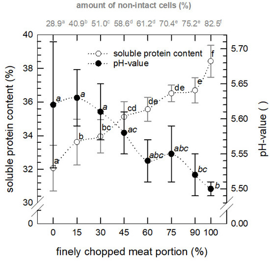 Soluble protein content (white) (n = 9) and pH value (black) (n = 9) of raw minced meat with finely chopped meat added (mean ± standard deviation), respectively. For comparability, amount of non-intact cells is illustrated on top of graph. Different letters indicate significant differences (p < 0.05) for each parameter (pH value in italic).
