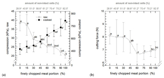 Mean ± standard deviation of (a) compression of raw (white) (n = 12) and cooked (black) (n = 27) minced meat with finely chopped meat added and (b) cutting force of cooked minced meatballs (n = 30). For comparability, amount of non-intact cells is illustrated on top of graph. Different letters indicate significant differences (p < 0.05) for each parameter (cooked in italic).