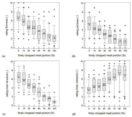 Boxplots of sensory evaluation of (a) firmness, (b) juiciness, (c) inner structure and (d) inner cohesion (n = 30) of cooked meatballs consisting of minced meat with finely chopped meat added; 0 means firm, dry, fine structure, and loose cohesion, whereas 10 means soft, juicy, coarse inner structure, and strong cohesion. Dotted line marks mean full line marks median, box marks lower and upper quartile, and whiskers mark distance until lower and upper extreme and single data points mark outliers. Different letters close to mean emphasize significant differences (p < 0.05) for each parameter.