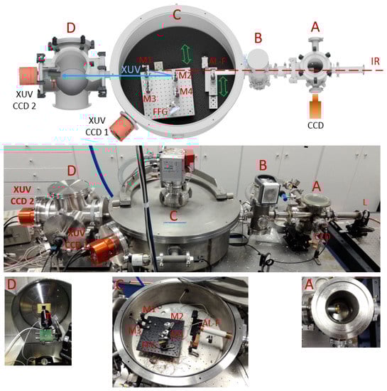 Our XUV CDI experimental setup, designed and developed at the Institute of Plasma Physics and Lasers (IPPL) [36], consists of four stages, depicted with letters A, B, C, and D as presented in Figure 1. The first stage, A, is the semi-infinite static cell filled with the gas target at pressures in the order of tens of mbar. The IR laser pulses have a central wavelength of 807 nm and are delivered by the Ti:Sa laser system (Amplitude Technologies) to the first stage of the setup with an energy of 1 mJ and a minimum pulse duration of 26 fs. The laser beam is focused by an cm lens at the neighborhood of the exit of the semi-infinite cell, which ends in a 100 m thin copper foil attached to a 1.5” aluminum tube. The foil is drilled by the laser beam, creating an exit pinhole of 50 to 100 m in diameter. The intense laser fields interact with the gas atoms, resulting in the generation of an XUV comb of higher-order harmonics that propagates along with the laser beam through the drilled pinhole to the second and third stages of the setup. The location of the laser beam focus in the neighborhood of the drilled pinhole area can be varied, by moving the lens micrometrically along the laser propagation axis. Moreover, the semi-infinite gas cell is equipped with a tube manifold for evacuating and filling it with a variety of gases, or even a mixture of gases if necessary, at accurately measured pressures during the experiment. Thus, the generated XUV radiation can be controlled and optimized with respect to the gas species and pressure, as well as to the location of the laser focus. In addition, the plasma formation inside the semi-infinite gas cell can be imaged by a CCD camera along with the corresponding XUV spectral images described below. This option is a powerful tool towards both the interpretation of the corresponding XUV spectral images characteristics, as well as the optimization of the coherent XUV generation at the predetermined wavelengths.