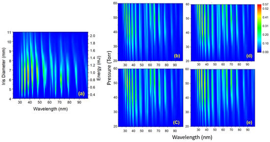 In Figure 2, some indicative results from this part of the study are presented. In Figure 2a, the dependence of the recorded XUV spectrum on the laser beam diameter and corresponding energies is shown. Here, the laser beam was truncated by an iris prior to its focusing, thus affecting the focal area and, therefore, the HHG. It can be clearly seen that an iris diameter of 7 mm provides the most intense harmonics for the spectral region of interest. This is a known effect due to geometrical phase-matching conditions [37]. Thus, we adopted this condition, which corresponds to an energy of 1 mJ, for all of our later studies. Even though these data were obtained for Ar gas at 60 mTorr, similar qualitative behavior was observed for other pressures and gases.