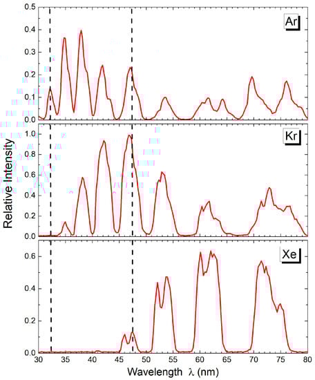 Another crucial parameter in the HHG optimization study is the generating gas in use. Since noble gases are mostly used in such studies, comparative HHG measurements using Ar, Kr, and Xe gases were performed. The HHG spectra were obtained using the setup with the scanning mode MCP detector as in the laser diameter and focusing studies. In Figure 3, the comparative HHG spectra for Ar, Kr, and Xe obtained are presented. An overall higher HHG efficiency was evident for Kr and Xe gases compared to Ar. This is due to their lower ionization potential (15.76 eV, 13.99 eV, and 12.13 eV for Ar, Kr, and Xe, respectively), which, however, affects their spectral cut-off. Specifically, Xe is known to have a maximum cut-off at laser peak intensities close to W/cm2, which corresponds to a cut-off of 43 nm, in accordance with our measurements. For the laser pulse energy of 1 mJ in use, the Ar and Kr cut-offs resulted in 30 and 32 nm, respectively, in accordance with our measurements. From this comparative study, it is clear that for the wavelengths of 47.6 nm and 32.2 nm, the use of Kr and Ar gases, respectively, is preferable.