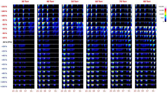 In Figure 4, a detailed study of the HHG efficiency as a function of the chirp of the laser pulses and for various Ar gas pressures is presented. As reported in [42], the maximum efficiency for HHG takes place for negatively chirped pulses with a duration around 50 fs and relatively high pressures. Thus, for optimizing the HHG generation at a predetermined central wavelength, we also varied the chirp of the laser pulses to low negative values.