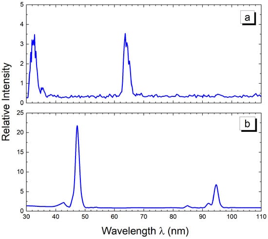 It can be seen that the pair of low-value wavelength mirrors transmits at a central wavelength of 32.2 nm with an FWHM of 2.5 nm, while the pair of high-value wavelength mirrors transmits at a central wavelength of 47.6 nm with an FWHM of 1.5 nm. The appearance of peaks at lower-value wavelengths in both spectra is due to the second order of diffraction, as can be inferred from their twice in magnitude wavelength value. Finally, it should be noted that for 32.2 nm, Ar gas was used, while for 47.6 Kr, gas was used, as resulted from the study on the gas types.