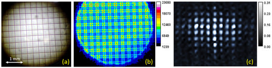 The overall coherence of the generated XUV radiation was initially tested by recording diffraction images resulting from the illumination of a copper mesh with 70 lines per inch and 5 m-thick wires. The copper mesh was placed at the entrance of the chamber of Stage C, and the diffraction images were recorded by the XUV CCD camera located at the end of the six-way cross of Stage D. A picture of the copper mesh is shown in Figure 6a, while in Figure 6b,c, the corresponding pictures of the diffraction image and the reconstructed image are shown, respectively. Since the diffraction image was obtained using the full XUV spectrum without any spectral filtering, there is no safe way to accurately calculate the characteristic dimension of the mesh from the reconstructed image. However, considering the optical geometry layout and using an average XUV wavelength of 50 nm, the characteristic dimension of the mesh was calculated close to the value given by the manufacturer.