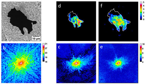The object was illuminated by the XUV beam just before its focus in order to cover as large area as possible of the object. Since the ROC of the spherical multilayer mirror is 1000 mm, this choice was not expected to affect the XUV phase front. Our automated system allowed the acquisition of a series of CDI images by moving the object in the plane perpendicular to the k-vector of the XUV beam. In Figure 7c,e, the CDI images for the wavelengths of 47.6 nm and 32.2 nm, respectively, are shown. These CDI images were selected in order to demonstrate the imaging capabilities of sub-micrometer details. In Figure 7b, the ideal calculated CDI image of the object is shown. Comparing the experimental CDI images for these two wavelengths, it is clearly shown that the smaller the wavelength, the finer the details of interference modulation in the k-space of the CDI image are, as expected.
