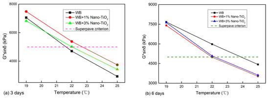 Figure 4 shows the fatigue factor (G*sinδ) results of compound-modified asphalt binders subjected to UV aging. As shown in Figure 4a, nano-TiO2 had effects on the fatigue resistance of WB. Under a given UV aging state (3 days of UV aging), the fatigue factor of the WB increased with the increase in nano-TiO2 dosages, and it is implied that the addition of nano-TiO2 can degrade the fatigue properties of asphalt binder. However, as the UV aging period increased from 3 days to 6 days, the fatigue factor of the WB decreased with the addition of nano-TiO2. Therefore, it can be inferred that adding nano-TiO2 can improve the fatigue cracking resistance of Sasobit and SBS-modified asphalt binders to some extent.
