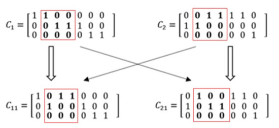 The basic process of GA starts with generating an initial population, i.e., a set of chromosomes following the above coding scheme. Then, it will run through the loop, including individual evaluation, selection, crossover, and variation, until satisfying the given termination condition. The cross operation plays a core role in GA, which acts on a group of chromosomes and generates new individuals by replacing part of the chromosomes of two father-generation individuals. Figure 2 shows a simple example of computation in a partially mapped crossover operator.