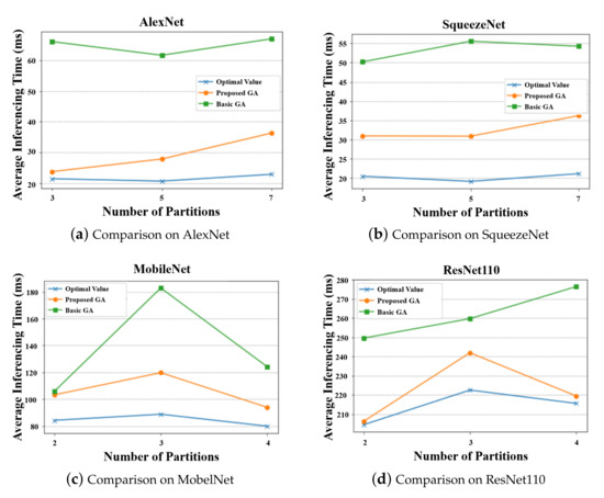 Firstly, Figure 4 shows the comparison of inferencing delay in each test case. In this figure, each sub-picture refers to a different CNN where the horizontal axis represents the number of partitions and the vertical axis represents the average inferencing time in milliseconds. It demonstrates that the inferencing delay resulting from the proposed GA is closer to the optimal value than basic GA. In addition, the trends of the proposed GA and the optimal value are also more similar.