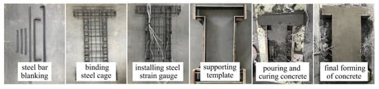 In this experiment, the purpose and content of the test, laboratory equipment conditions, and other factors were comprehensively considered. According to the requirements of transportation, installation, loading, and measurement in the design and production of reinforced concrete shear wall specimens in JGJ/T 101-2015 [], three coal gangue concrete shear wall specimens were designed. The conventional concrete shear wall was designated RFSW-1, the concrete shear wall number with a 50% coal gangue replacement rate was designated CGSW-2, and the concrete shear wall number with a 100% coal gangue replacement rate was designated CGSW-3. The shear wall height was 1200 mm, the width was 600 mm, the thickness was 120 mm, and the shear span-to-depth ratio was 2. The concrete strength grade of the coal gangue concrete shear wall was C30, and the reinforcement of the shear wall was made of HRB335 rebar. The horizontal and vertical reinforcements of the wall were in line with the structural conditions in JGJ 3–2010 []. All specimens had the same overall dimensions and arrangement of reinforcements (refer to Figure 1). The parameters of the specimens are shown in Table 1. The specimen preparation process (refer to Figure 2) included steel bar blanking, binding steel cage, installing steel strain gauges, supporting template, pouring and curing concrete, and installing concrete strain gauges.