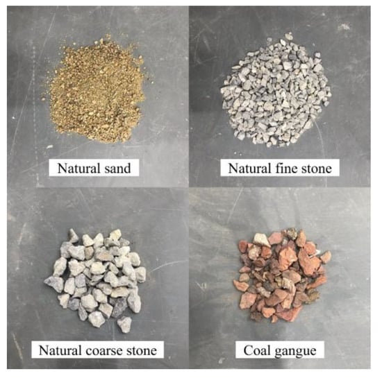 In this study, ordinary Portland cement and grade II fly ash were used as cementitious materials. Polycarboxylate superplasticizer with a water reducing rate up to 20% was used as the water reducing agent. Natural river sand with a fineness modulus of 3.06 was used as the fine aggregate. Natural crushed stone and spontaneous combustion coal gangue with particle sizes of 5–20 mm were used as coarse aggregates. The aggregate used for concrete is shown in Figure 3.