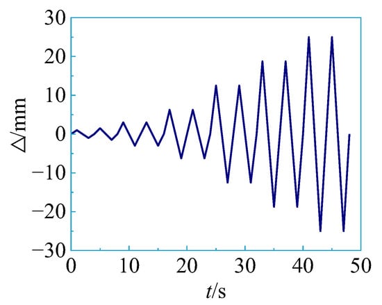 Each specimen was gradually loaded to the required value using a vertical jack, and the load remained constant throughout the test process, in which the axial compression ratio was 0.1. The horizontal jack was controlled by an oil pump to achieve lateral cyclic loading. It was difficult to determine the yield point of the specimen during the test, so displacement control loading was adopted. The drift ratio parameter θ = D/H was defined (where D was the displacement of the top of the specimen, and H was the height of the loading beam half of the specimen to the foundation beam). The test loading protocol was divided into seven levels. The preloading drift ratio θ was 1/1500; when the drift ratio θ < 1/240, the increment of θ was 1/1000; and when the drift ratio θ ≥ 1/240, the increment of θ was 1/240. The test loading protocol diagram is shown in Figure 5, and the specific values of the loading drift ratio are shown in Table 5.