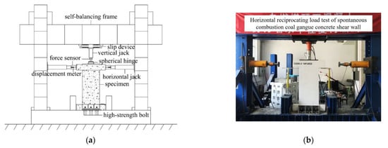 The experiment was carried out in the structural laboratory of Liaoning Technical University, and a quasi-static test method was used to simulate seismic action. The vertical load and horizontal displacement were applied through vertical and horizontal jacks during the whole test process, respectively, and the load and displacement were measured by force sensors and displacement meters. To ensure that the vertical load was uniformly transmitted to the entire specimen, a load distribution rigid plate was set. During the horizontal movement of the loading beam, the slip device needed to be set to ensure that the upper equipment could move horizontally with the loading beam. In the loading process, a spherical hinge was used to prevent deviation of the test data due to the tilt of the upper equipment. The foundation beam of the specimen was connected to the self-balancing reaction frame by high-strength bolts and an L-shaped consolidation steel plate to achieve vertical and out-of-plane constraints. The horizontal direction was constrained by a steel plate and high-strength bolt to achieve complete fixation at the bottom of the specimen. To prevent the influence of the slip of the foundation beam on the test results, a base slip displacement meter was placed on the foundation beam. The test setup is shown in Figure 6.