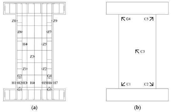In the test, the reinforcement strain and concrete strain needed to be measured. To better study the stress characteristics of the plastic hinge zone of coal gangue concrete shear walls, reinforcement strain gauges were placed at the stirrups and longitudinal reinforcements at the bottom of each specimen. In addition, reinforcement strain gauges were obliquely arranged on the upper part of the longitudinal reinforcement. For concrete strain gauges, strain flowers were placed around and at the center of the specimen. The specific distribution of the strain gauges is shown in Figure 7, where G1–G4 are the strain gauges at the bottom of the stirrup, and H1–H7 are the strain gauges at the bottom of the longitudinal reinforcement, and Z1–Z9 are the strain gauges at the top of the longitudinal reinforcement.