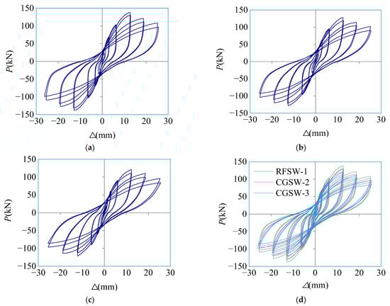 Hysteretic curves of the specimens (a) RFSW-1 (b) CGSW-2 (c) CGSW-3 (d) Comparison.