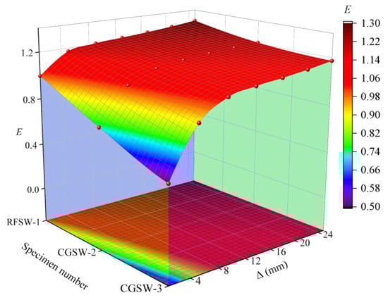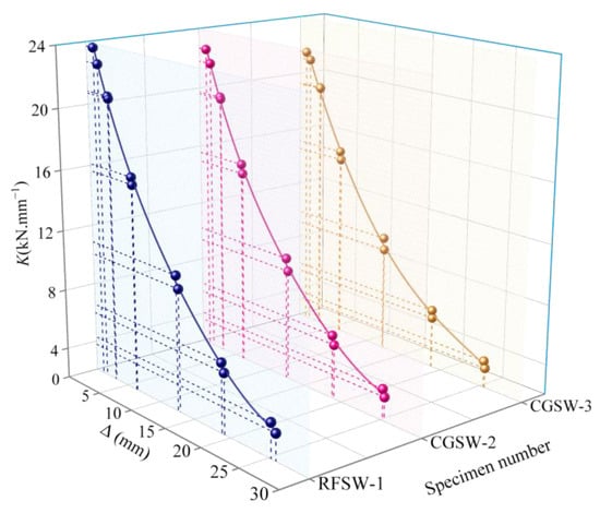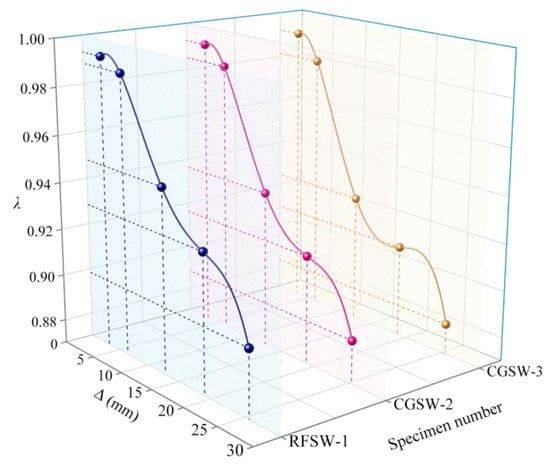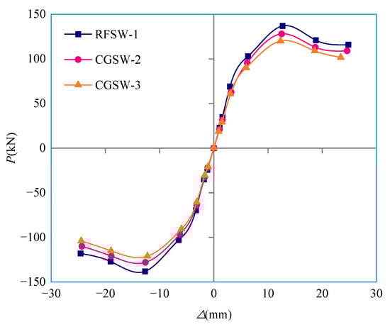 Table 6 shows that with the increase in the coal gangue replacement rate, the load values at the characteristic points of the three specimens decrease. Horizontal ultimate bearing capacity of specimen RFSW-1 is the largest. Compared with specimen RFSW-1, the peak load of specimens CGSW-2 and CGSW-3 decreases by 6.8% and 12.4%, respectively, while the yield load decreases by 5.6% and 8.5%, respectively, indicating that the increase in the coal gangue replacement rate will reduce the horizontal bearing capacity of the concrete shear wall specimens.